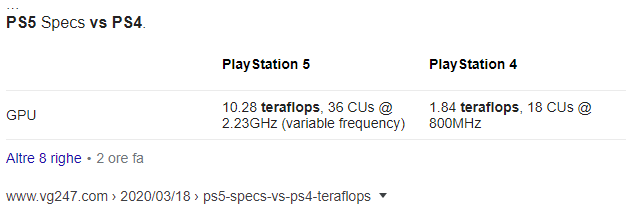 Ebbene, PS5 è quasi sei volte più potente di PS4 al netto di tutte le potenze calcolate e quel “forse anche di più” suona come l’ingenua speranza di un ignorantone in materia hardware, quale effettivamente sono. Lascio un’immagine che valga centinaia di parole.