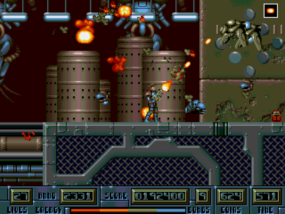 Quello che non è stato praticamente toccato è il sistema di controllo, che vorrebbe essere fluido e appagante come quello di Turrican 2 ma non è stato cesellato a dovere. Questo comporta, di tanto in tanto, qualche difficoltà a sparare in diagonale in alto o in basso, oppure a chinarsi a comando. Con un po’ di abitudine, comunque, il nostro alter-ego (un nerboruto space marine con armatura vagamente ispirata a quella dei Sayan di Dragon Ball).