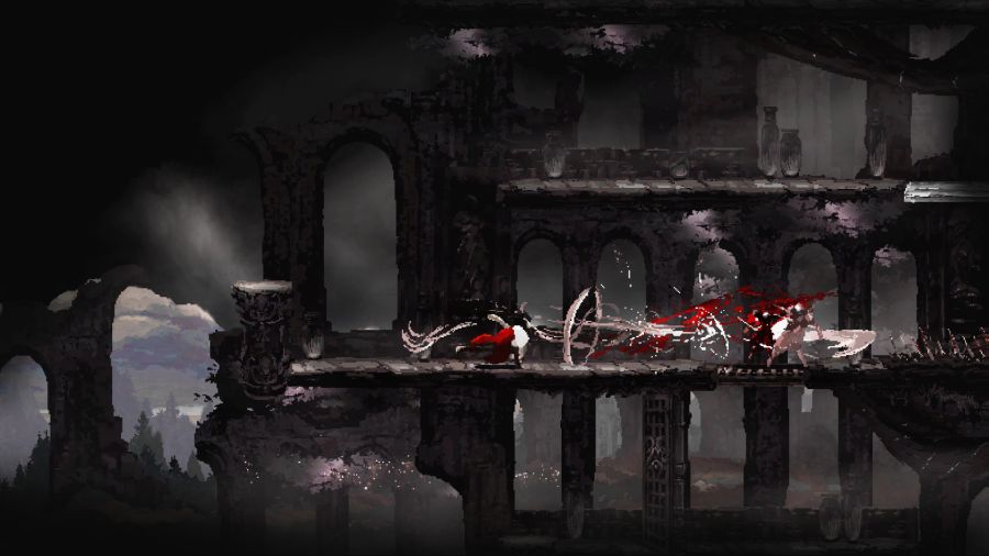 Ciò che mi ha colpito più di Moonscars, a primo impatto, è il punto d’unione fra una pixel art ben concepita, animazioni estremamente convincenti ed un sistema di gioco che punta molto sulla sinergia di ogni azione di cui il protagonista è dotato.