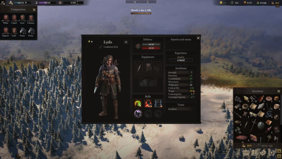 Ogni missione e combattimento ci frutta punti esperienza, materie prime, moneta di scambio ed equipaggiamenti. Con l’esperienza miglioriamo le capacità di sopravvivenza e di combattimento della nostra compagnia di ventura. Con le materie prime, uno dei nostri può improvvisarsi fabbro o carpentiere e fare anche lì gavetta in questi mestieri. Con la moneta compriamo equipaggiamenti pronti, razioni da viaggio, materie prime aggiuntive.